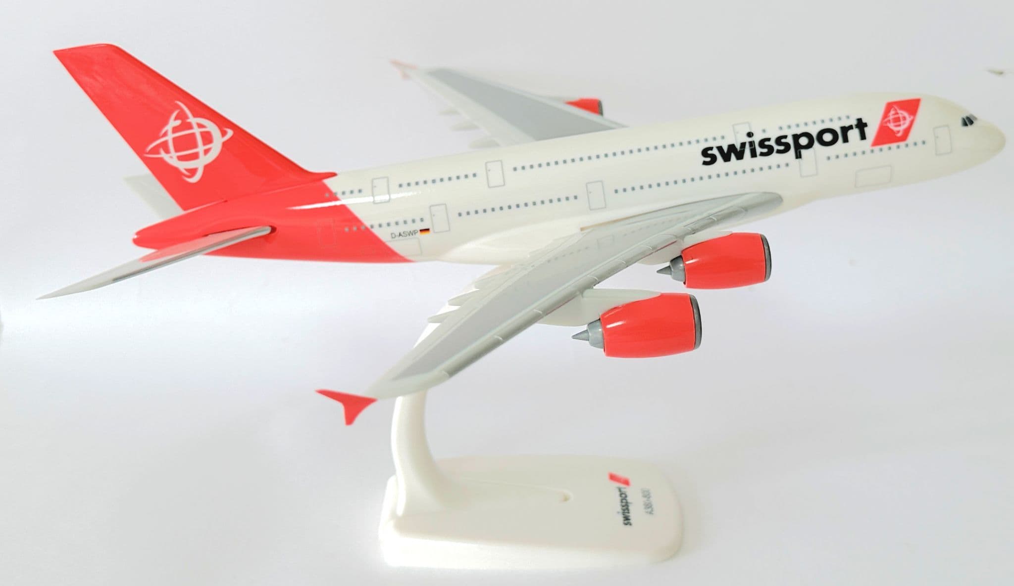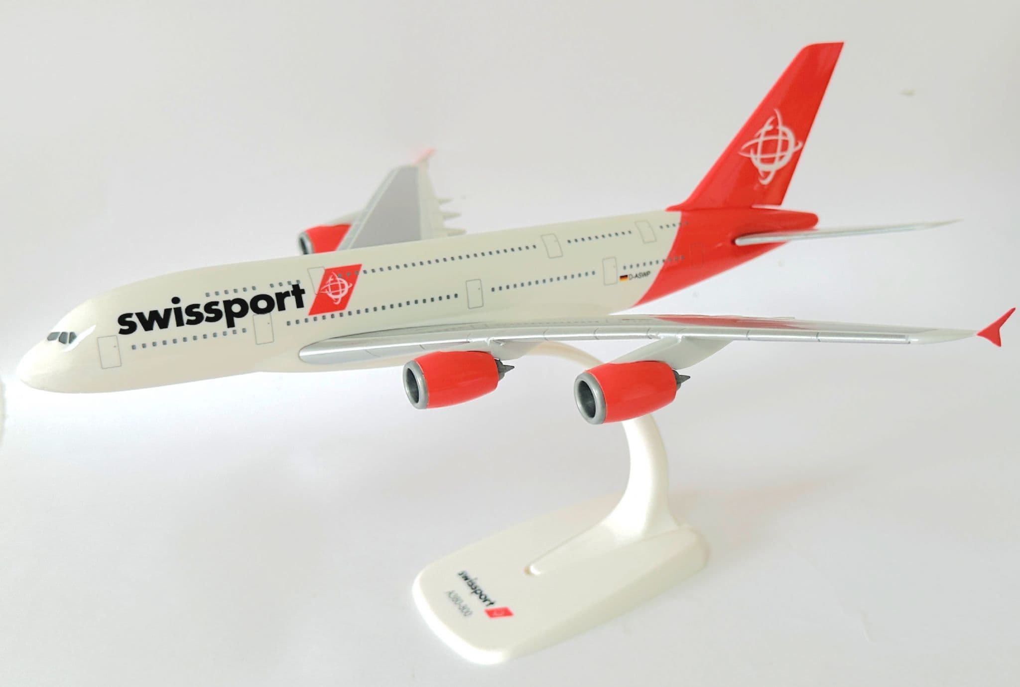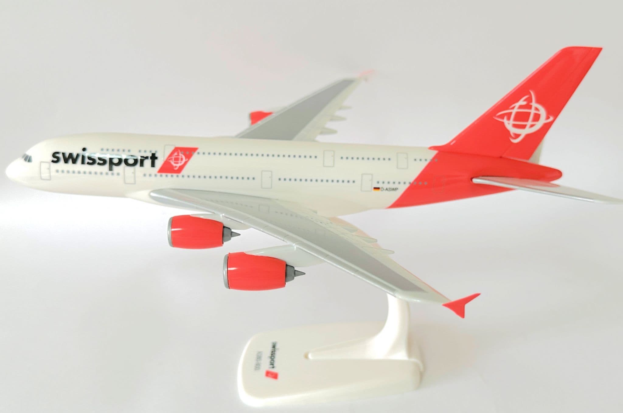 This Airbus A380 Swissport Herpa PPC Snap-Fit Collectors Model in 1:250 scale is a distinctive and finely detailed replica celebrating one of the most recognisable names in global ground handling and aviation services. Featuring the Swissport corporate livery, this model showcases the Airbus A380, the world’s largest passenger aircraft, in striking red, white, and grey tones—symbolising excellence and reliability in aviation operations.
