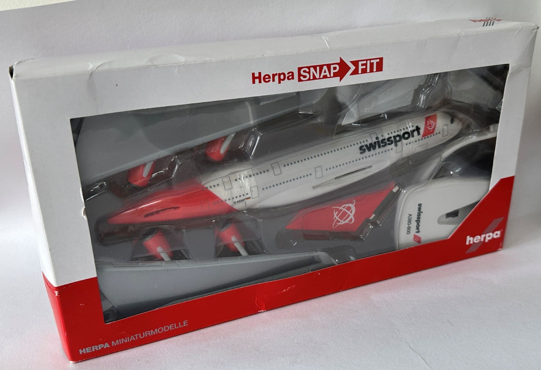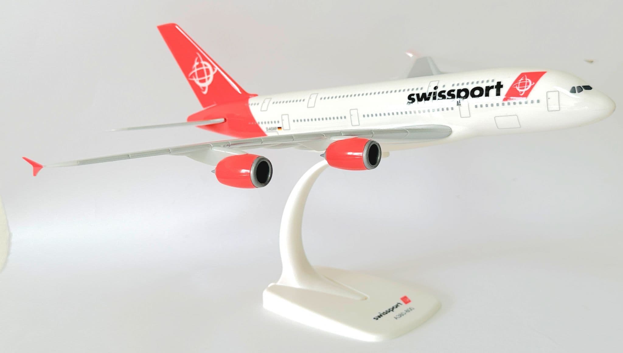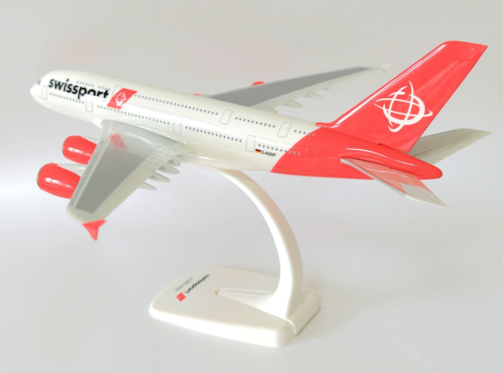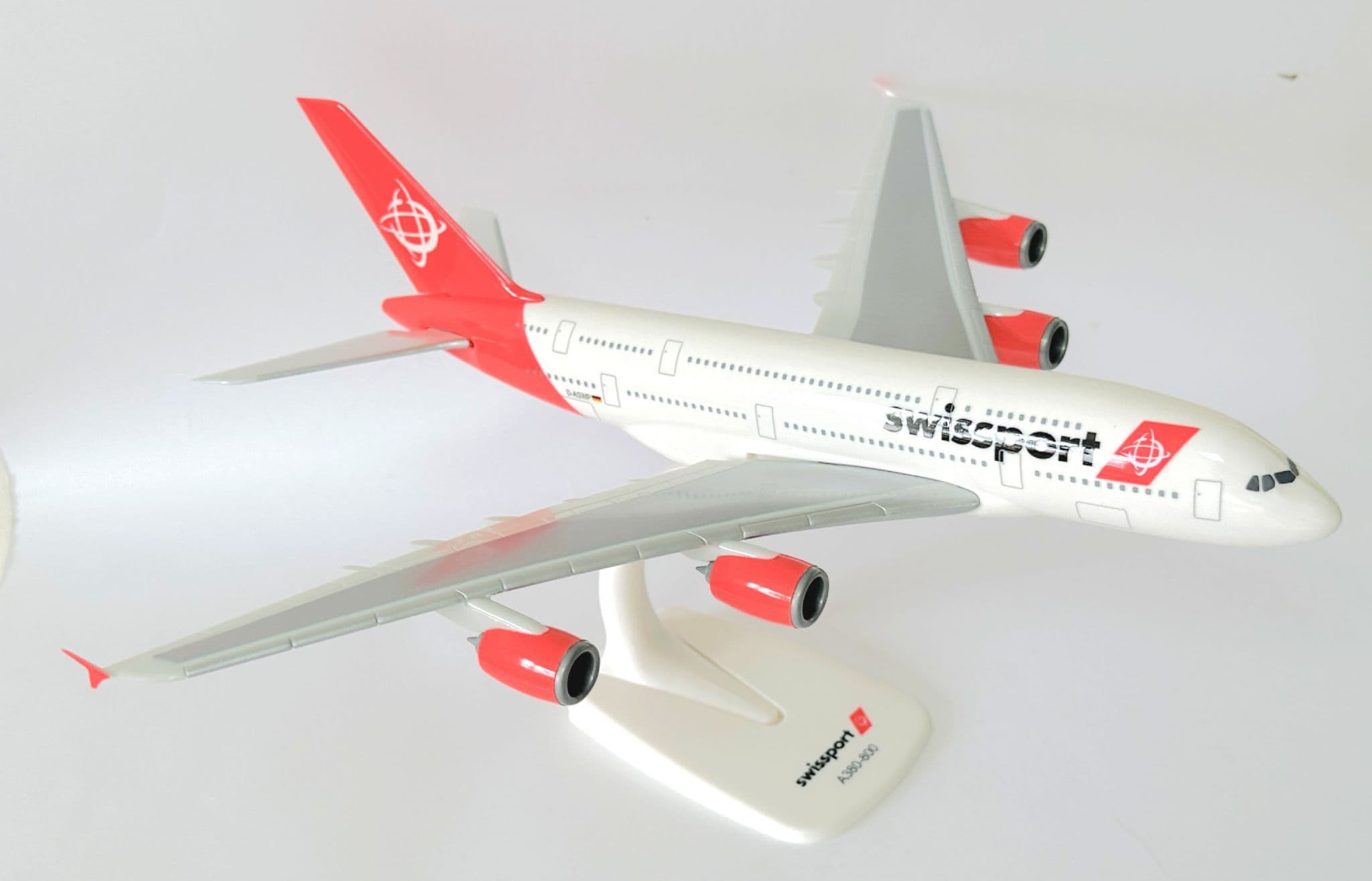 This Airbus A380 Swissport Herpa PPC Snap-Fit Collectors Model in 1:250 scale is a distinctive and finely detailed replica celebrating one of the most recognisable names in global ground handling and aviation services. Featuring the Swissport corporate livery, this model showcases the Airbus A380, the world’s largest passenger aircraft, in striking red, white, and grey tones—symbolising excellence and reliability in aviation operations.