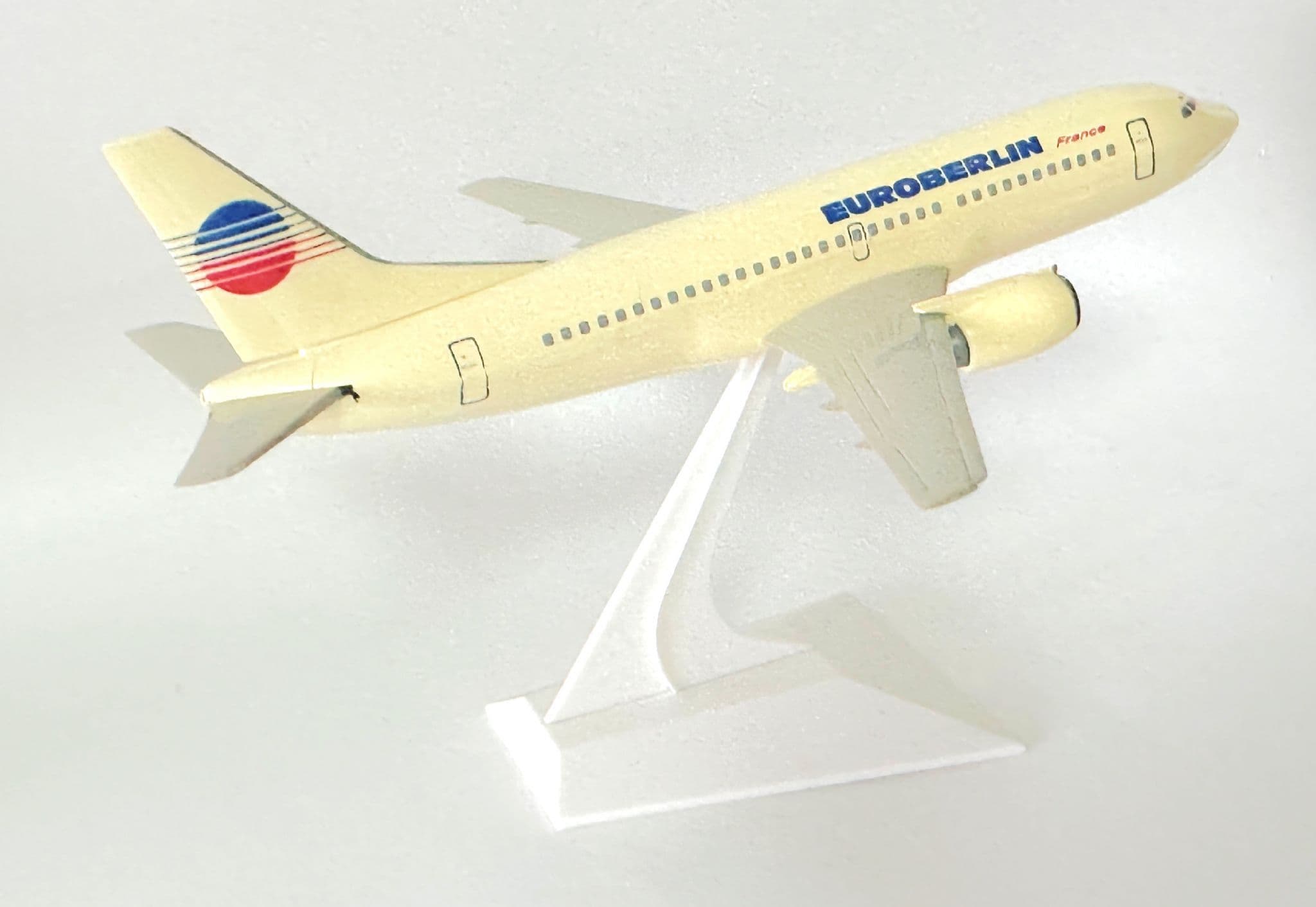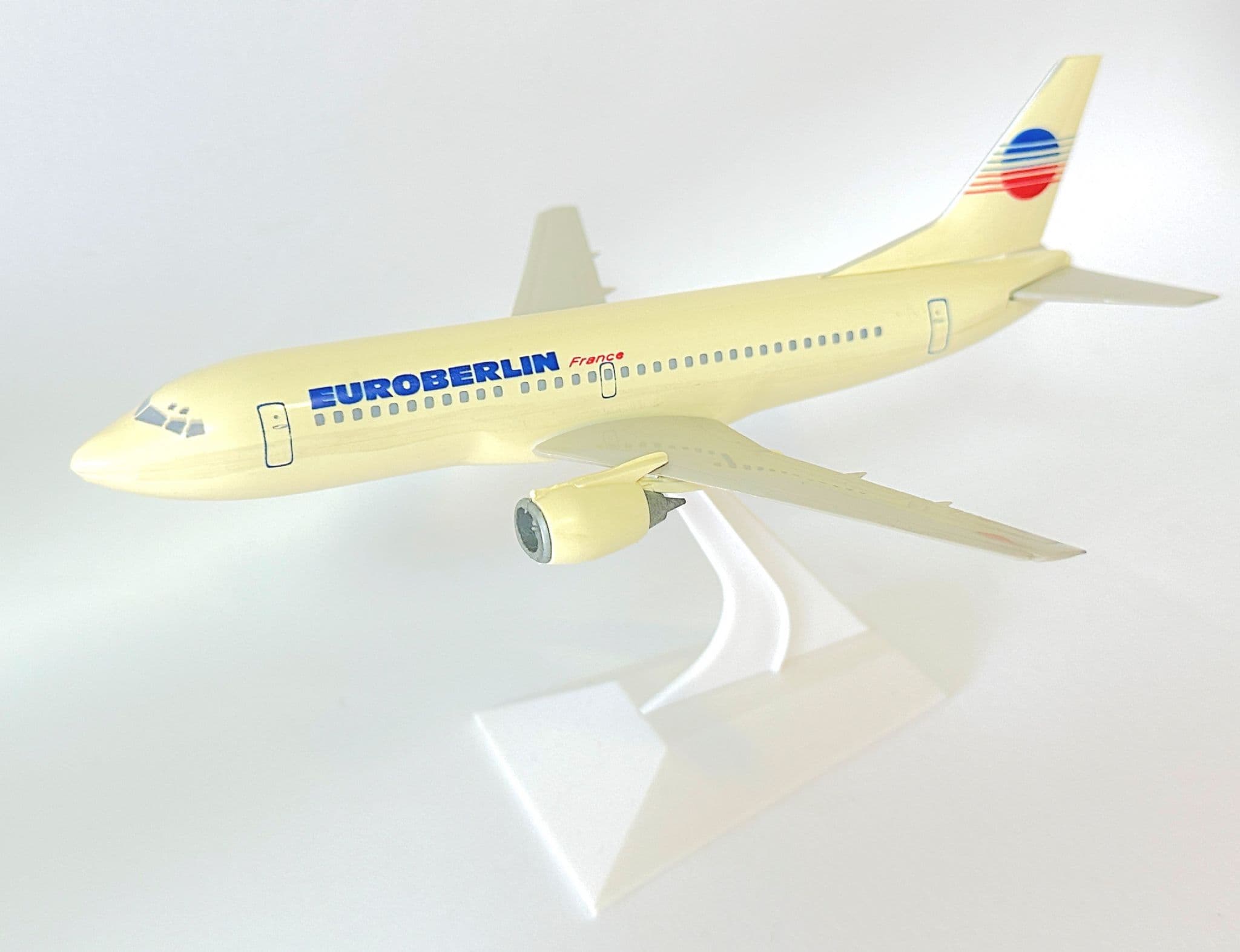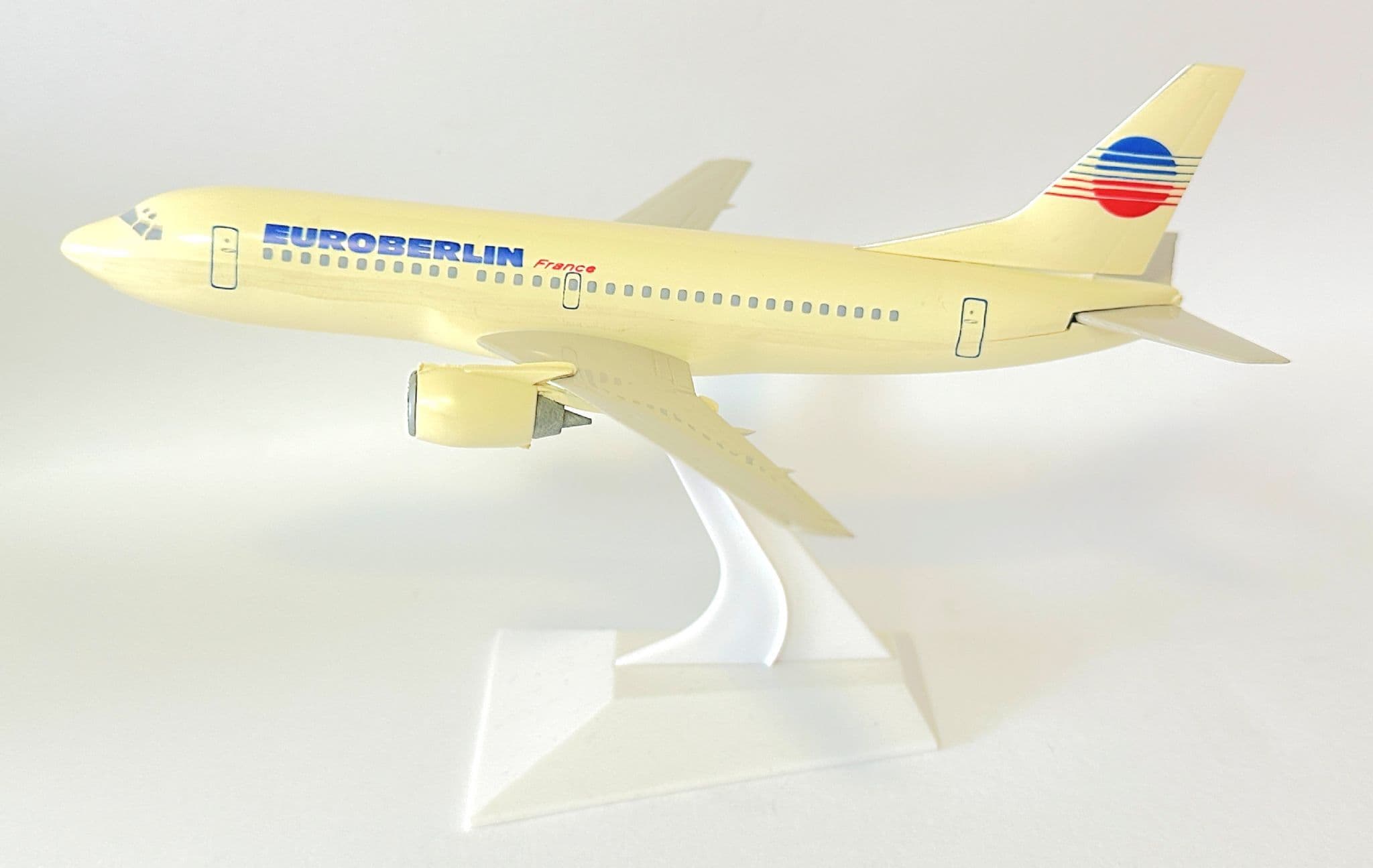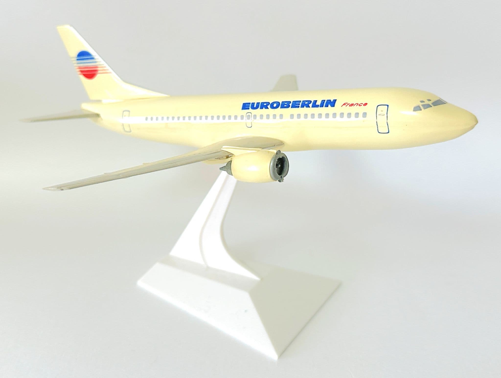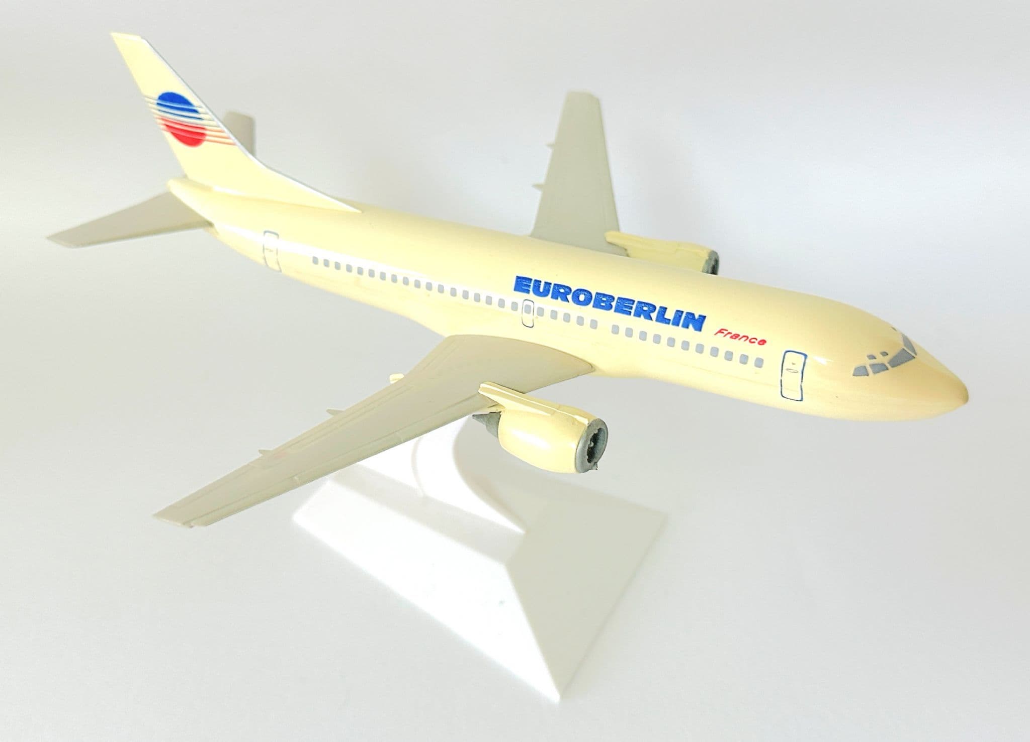 Made from durable plastic with a smooth, high-gloss finish, the model captures the clean lines of the popular 737-300 aircraft — a mainstay of European aviation during the period. It features the EuroBerlin France logo and livery, making it an excellent nostalgic addition for collectors of vintage airline memorabilia.