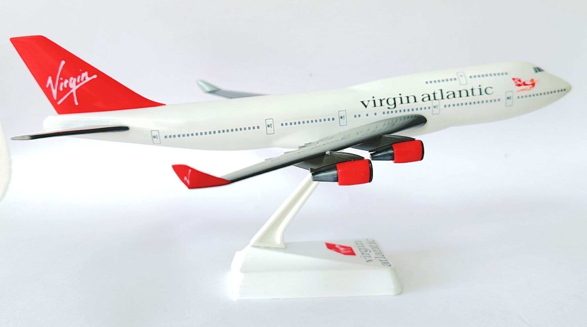 Constructed from durable plastic with a clean snap-fit design, this model requires no glue or tools—making it perfect for collectors and aviation enthusiasts alike. The aircraft features accurately rendered proportions, detailed engine nacelles, and the classic hump of the 747’s upper deck, all reflecting the graceful design of Virgin Atlantic’s long-haul flagship.