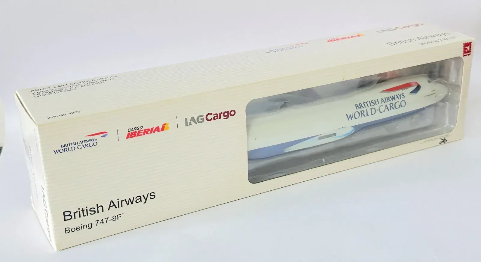 Celebrate the enduring legacy of the Queen of the Skies with this Boeing 747-8 British Airways Cargo Hogan Premium Collectors Model in 1:200 scale. Showcasing the sleek lines and extended fuselage of the 747-8 Freighter variant, this model is adorned in British Airways World Cargo livery, reflecting the airline’s prestigious role in global air freight operations.