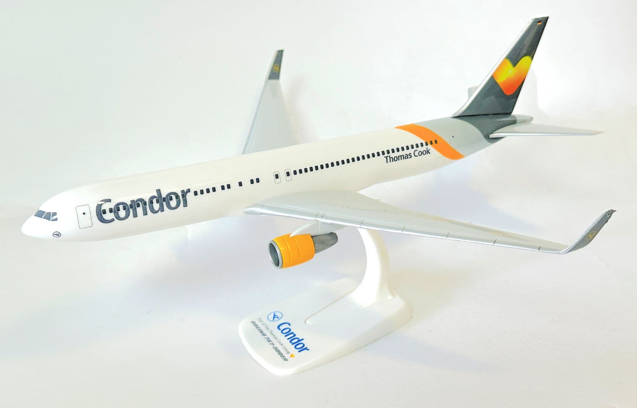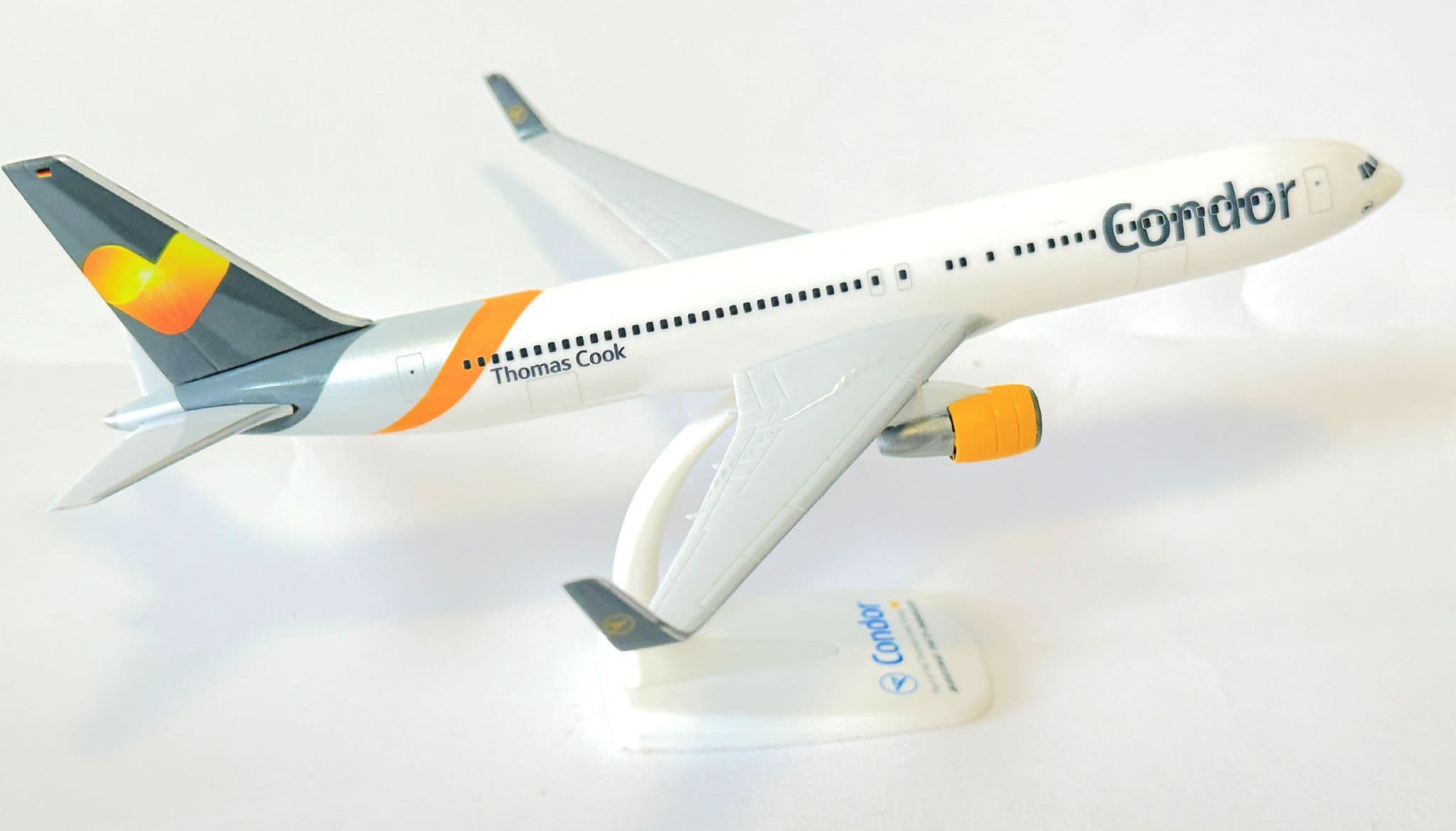 Beautifully finished with accurate proportions and vivid printed details, this model captures the aircraft as it appeared flying long-haul holiday routes across Europe and beyond. Whether you're a fan of Condor, Thomas Cook, or airline liveries, this piece makes an eye-catching and meaningful addition to any aviation collection.