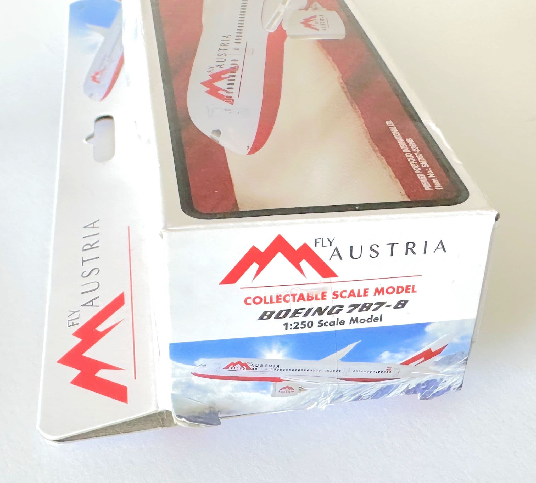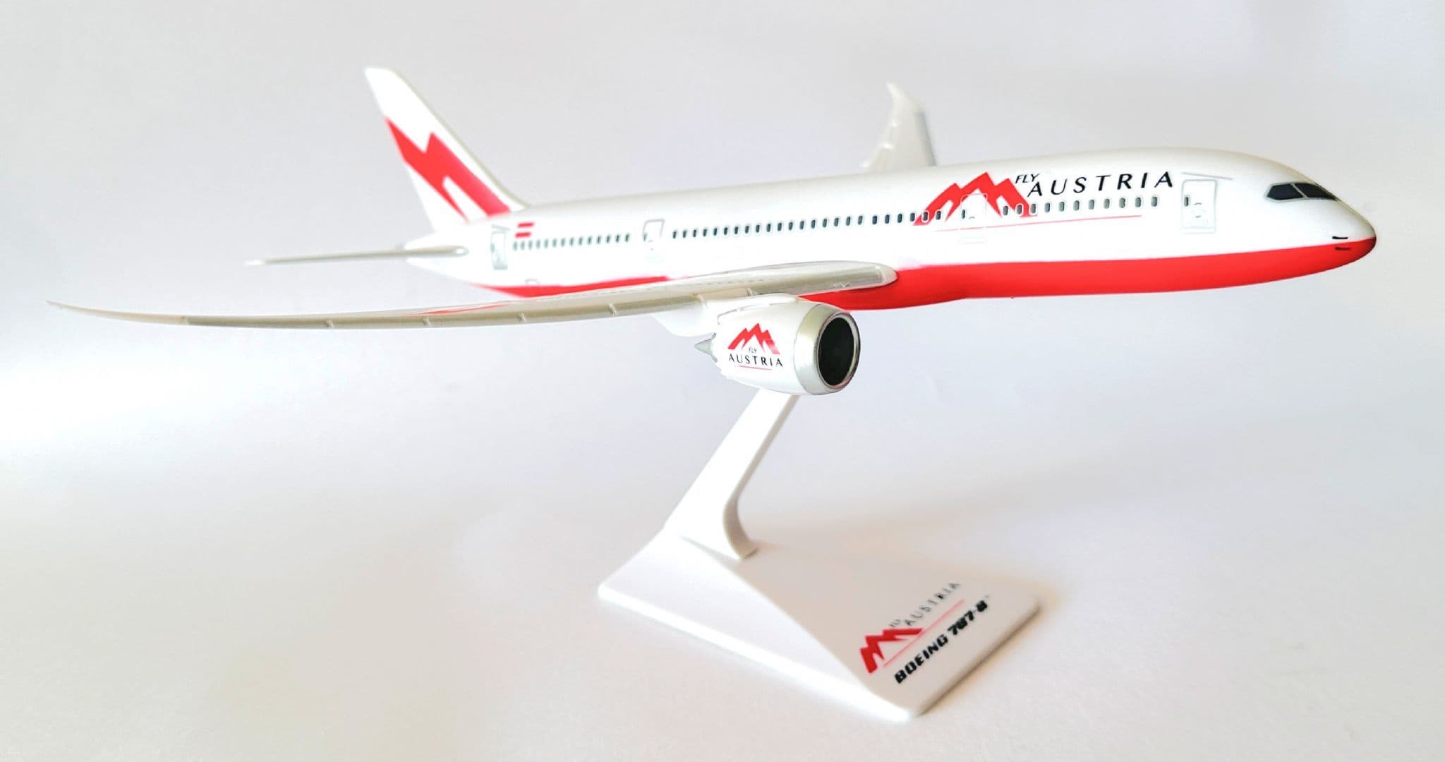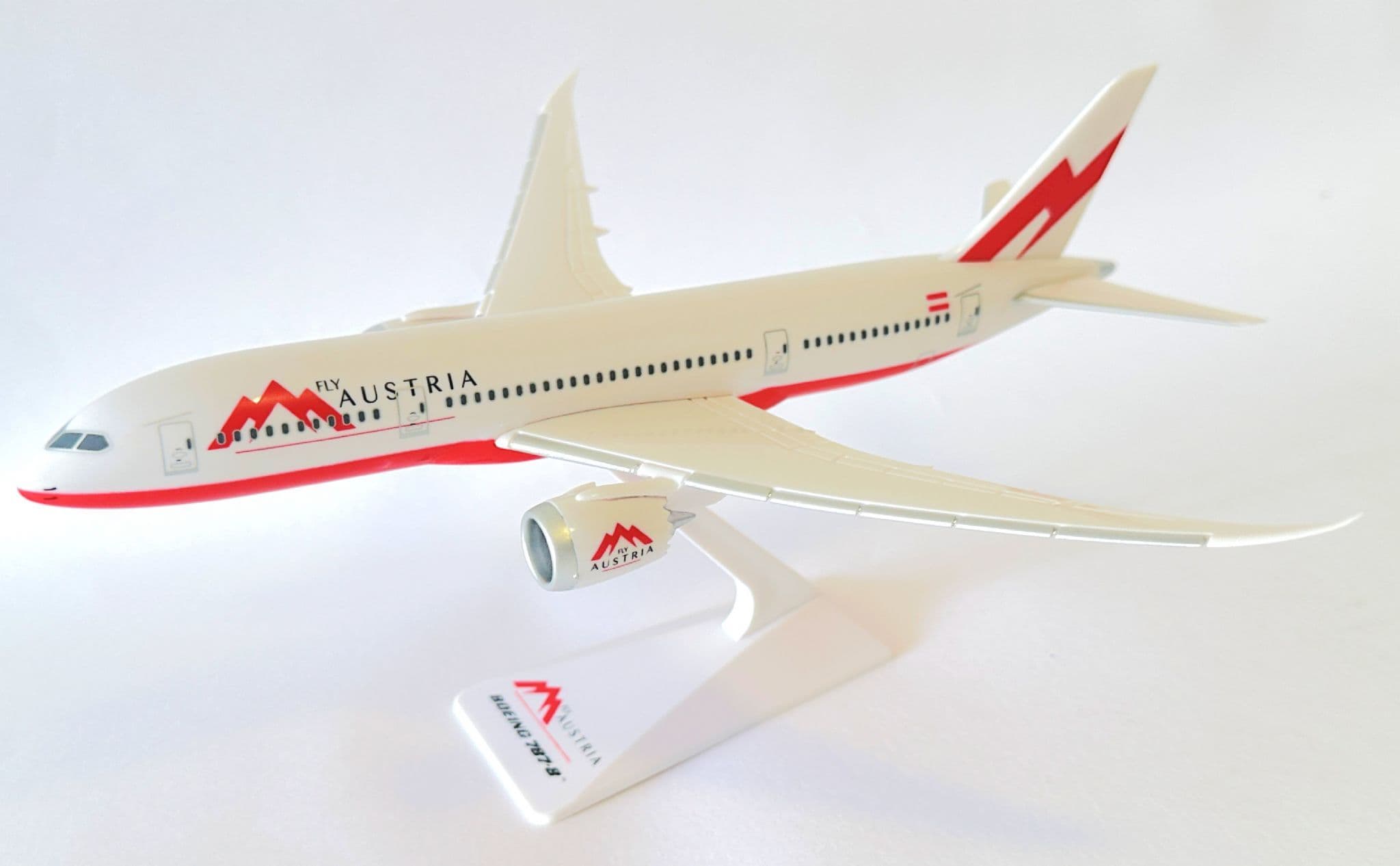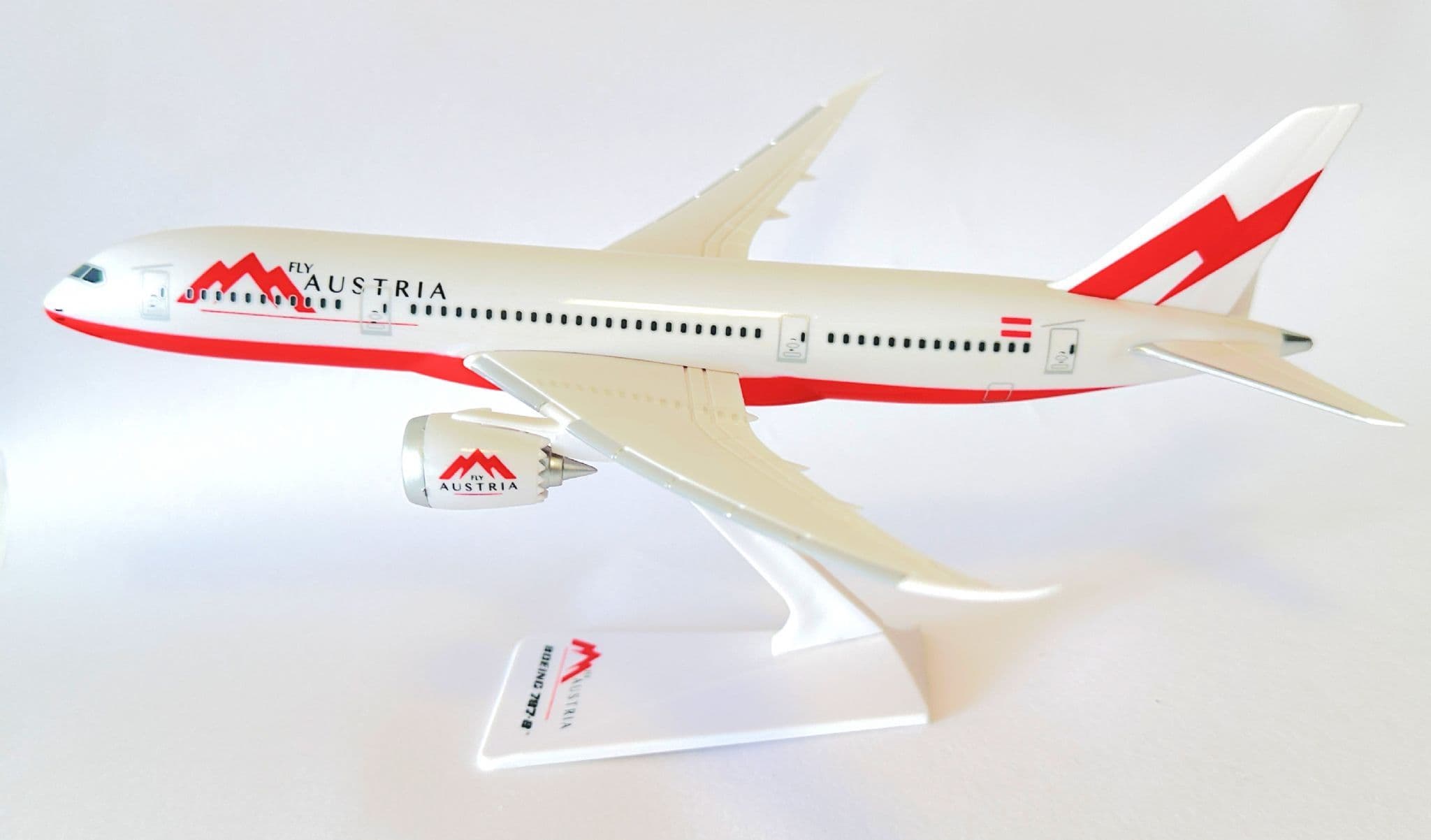 Celebrate modern Austrian aviation with this Boeing 787-8 Fly Austria Snap Fit Collectors Model in 1:250 scale. Designed with authentic livery and fine detailing, it offers a realistic representation of the Dreamliner. The snap-fit construction allows easy assembly without glue, and the included display stand makes it perfect for showcasing.