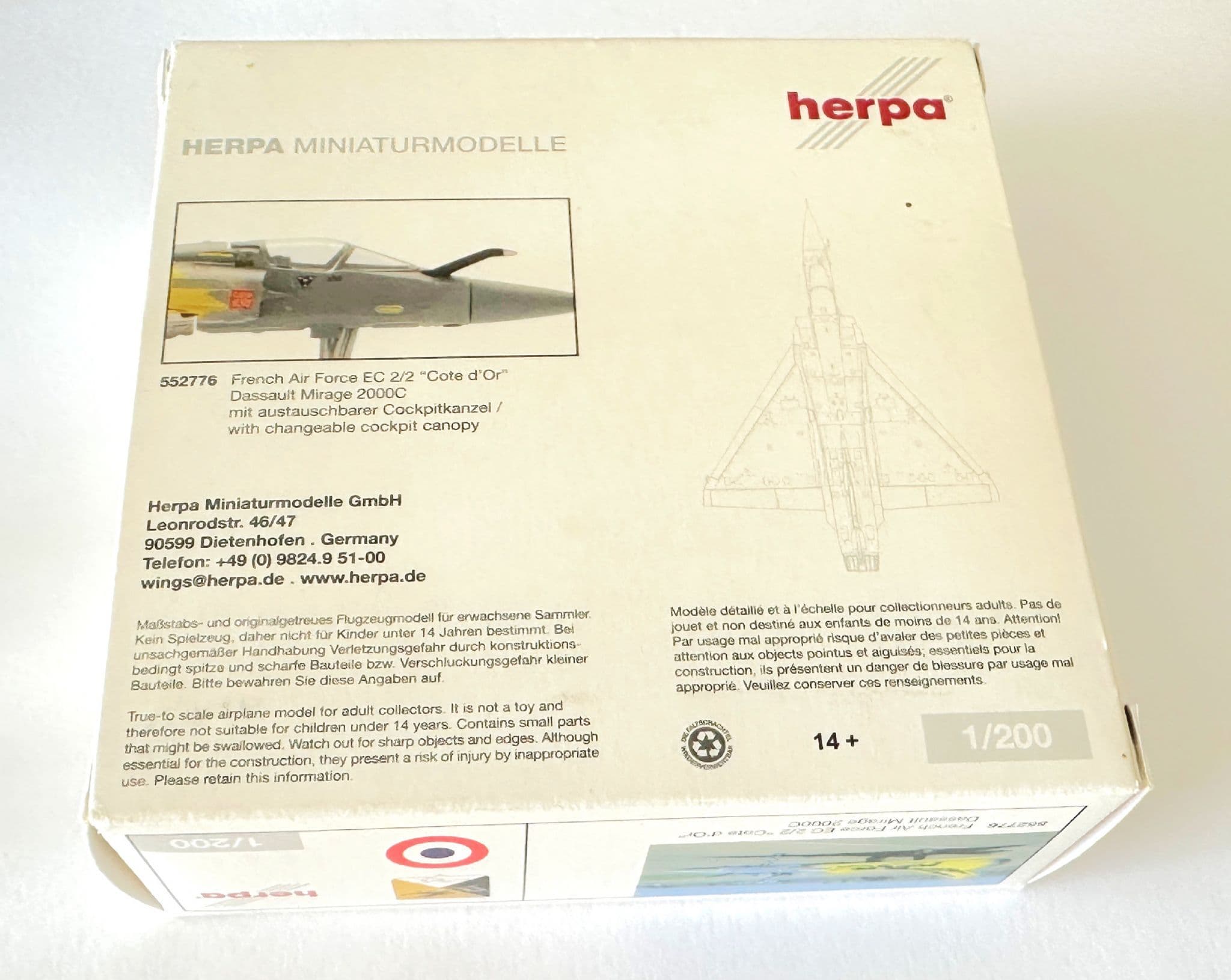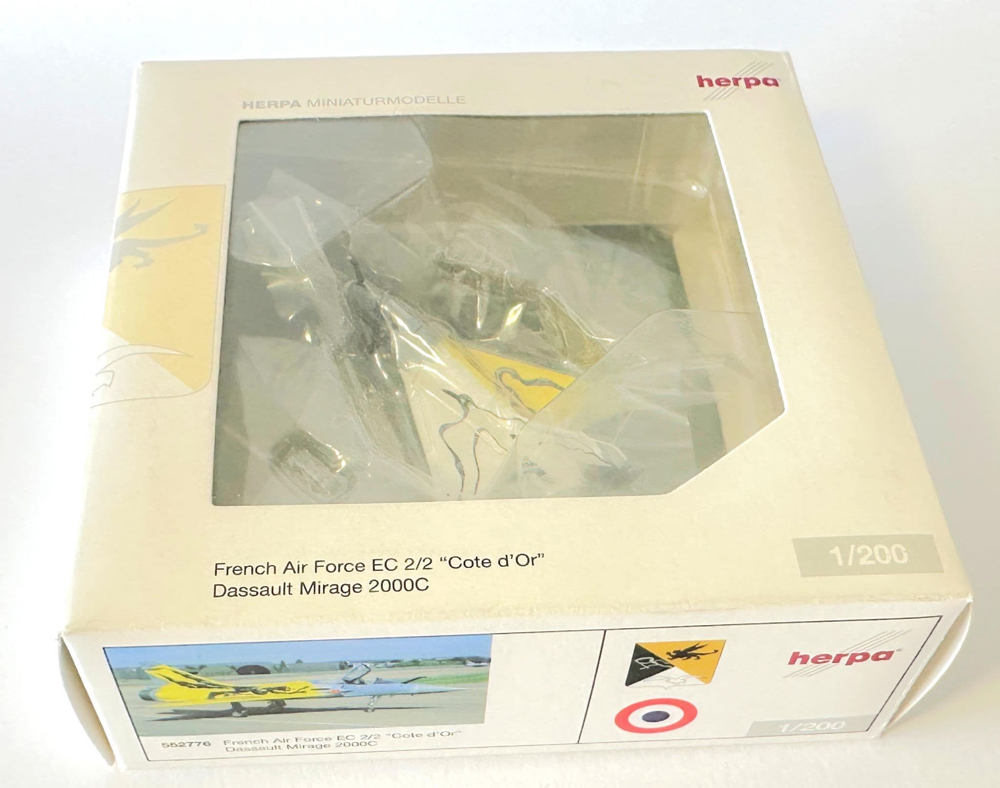 Own a piece of modern military aviation history with this highly detailed Dassault Mirage 2000C collectors model by Herpa, produced in 1:200 scale. This diecast model accurately represents the iconic French Air Force multirole fighter, known for its delta-wing design and operational versatility.