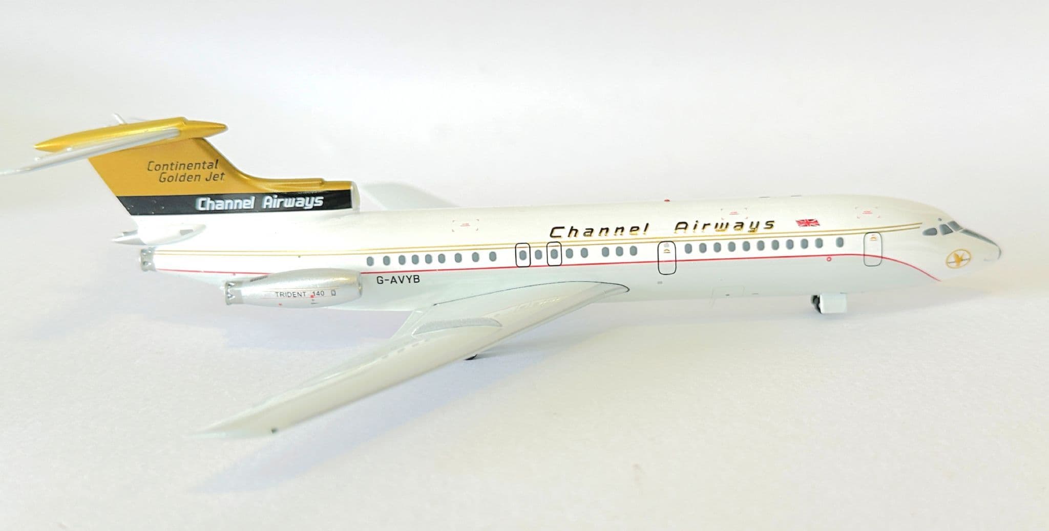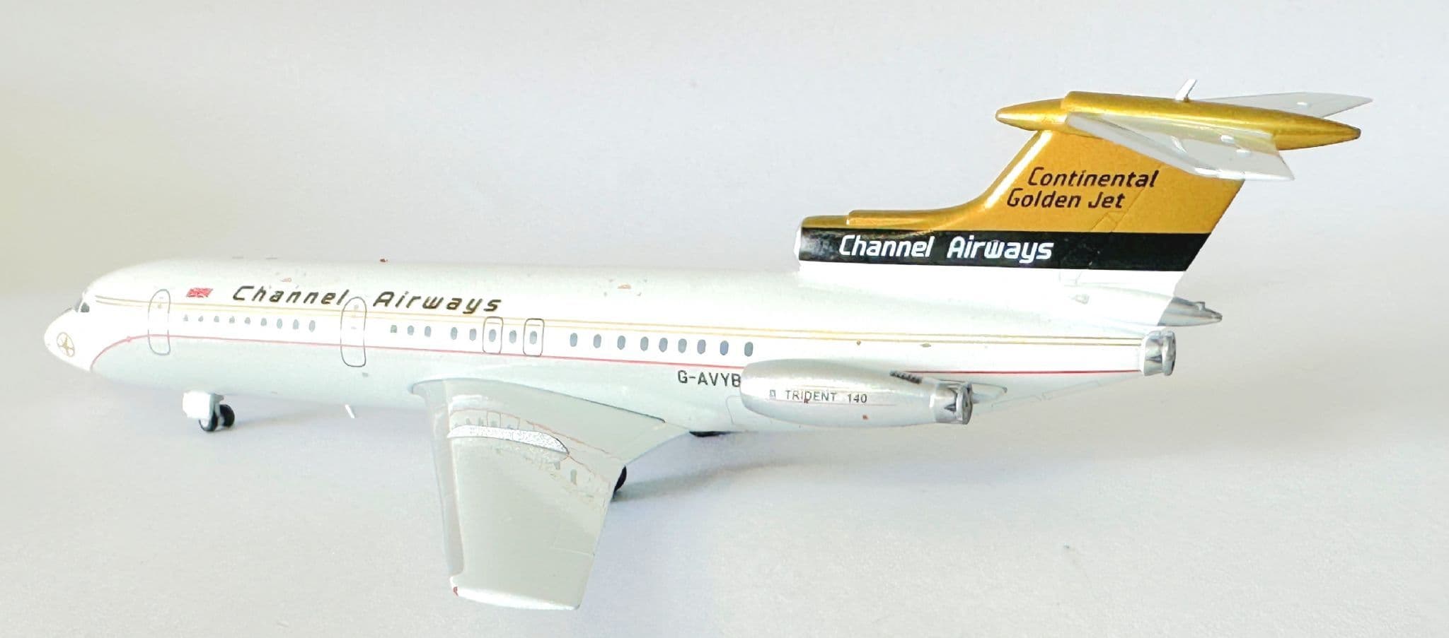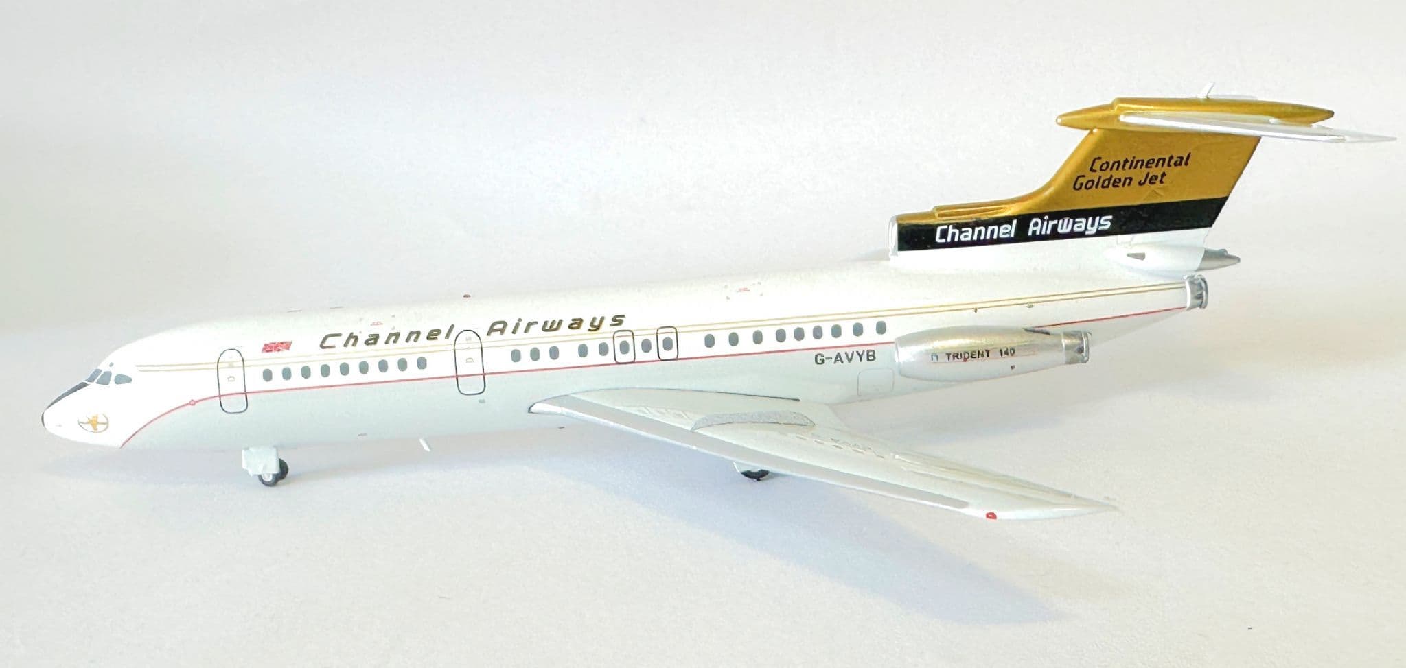 Add a rare and historic British airliner to your collection with this Hawker Siddeley HS-121 Trident 1E Channel Airways metal collectors model, produced in 1:200 scale. Featuring the classic Channel Airways livery, this model captures the distinctive tri-jet design and vintage character of one of the early UK jetliners.
