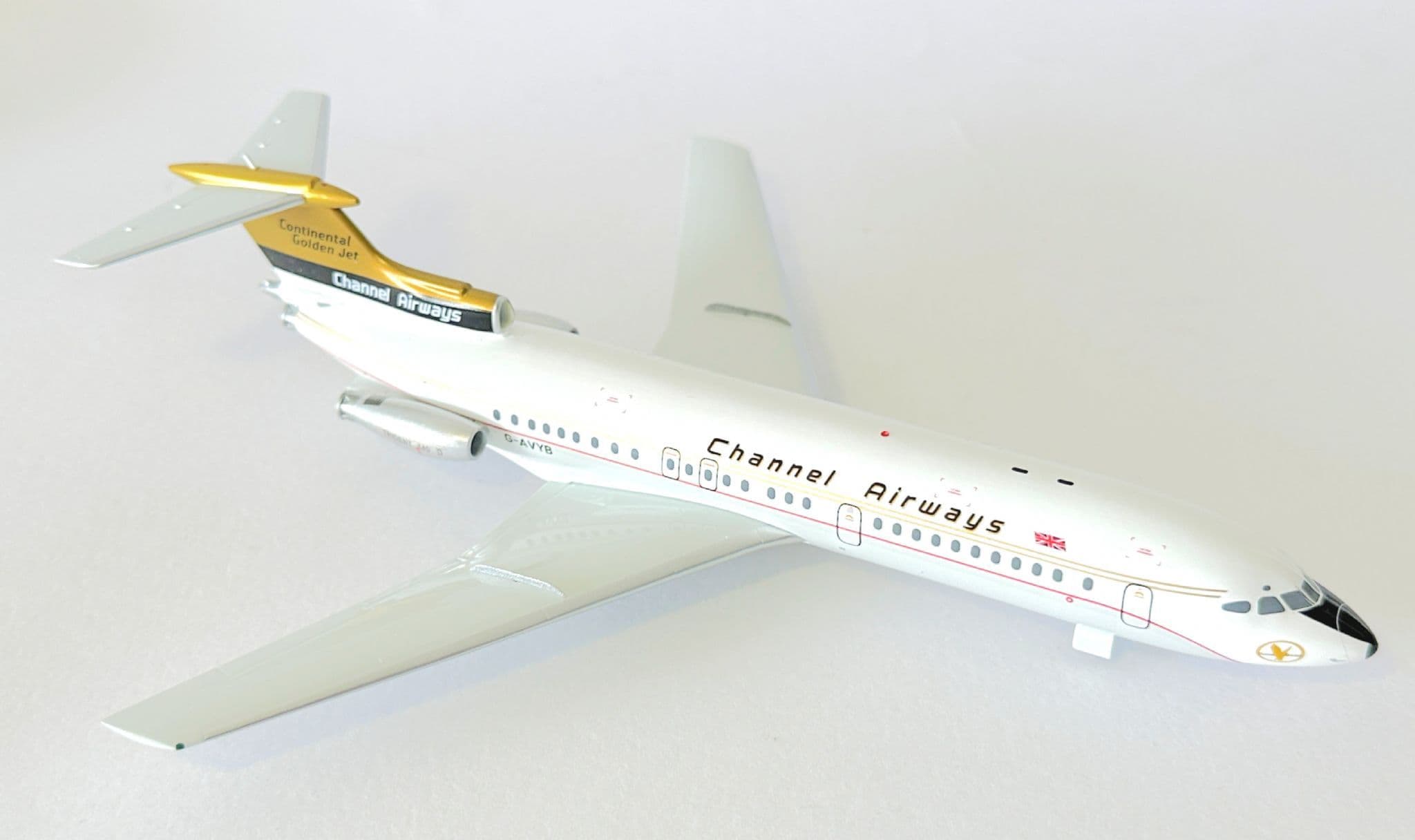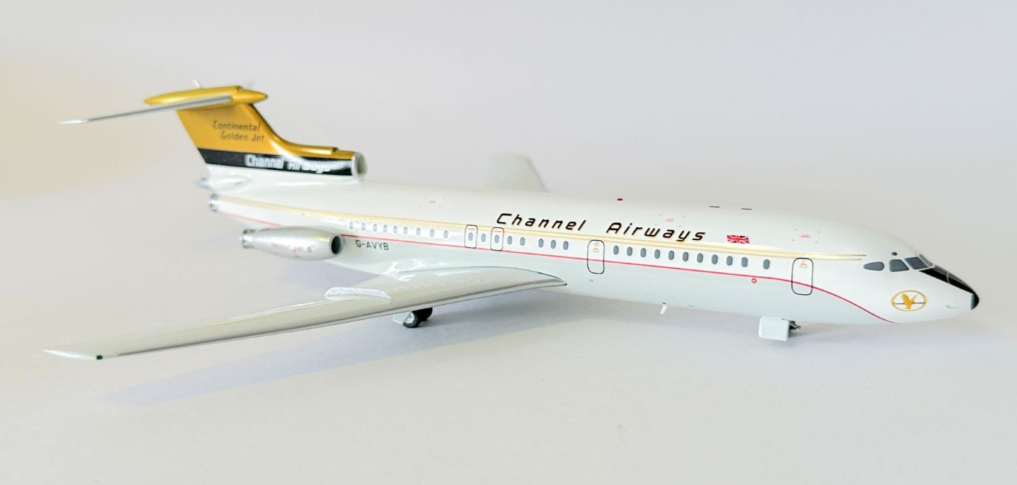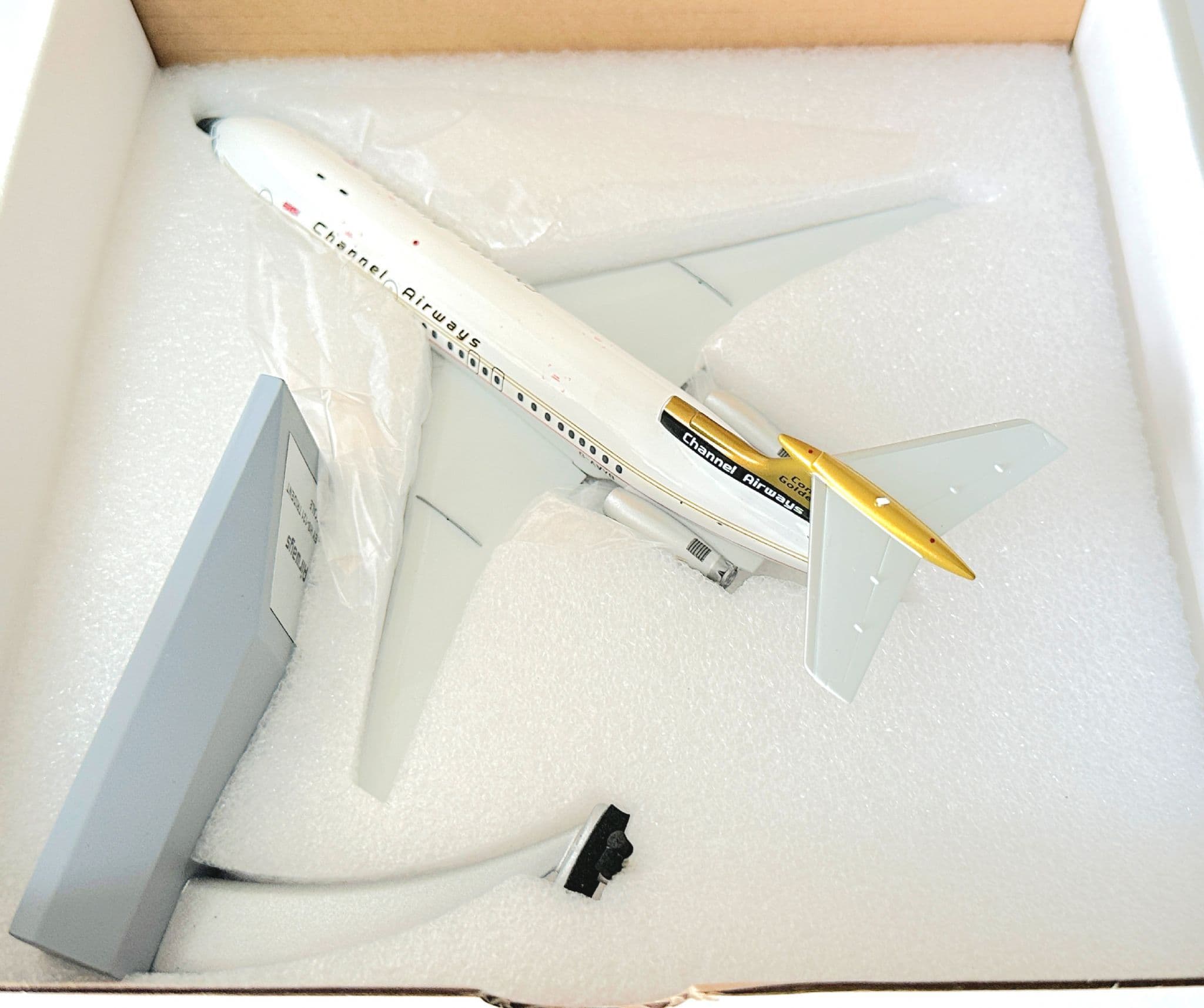 Add a rare and historic British airliner to your collection with this Hawker Siddeley HS-121 Trident 1E Channel Airways metal collectors model, produced in 1:200 scale. Featuring the classic Channel Airways livery, this model captures the distinctive tri-jet design and vintage character of one of the early UK jetliners.